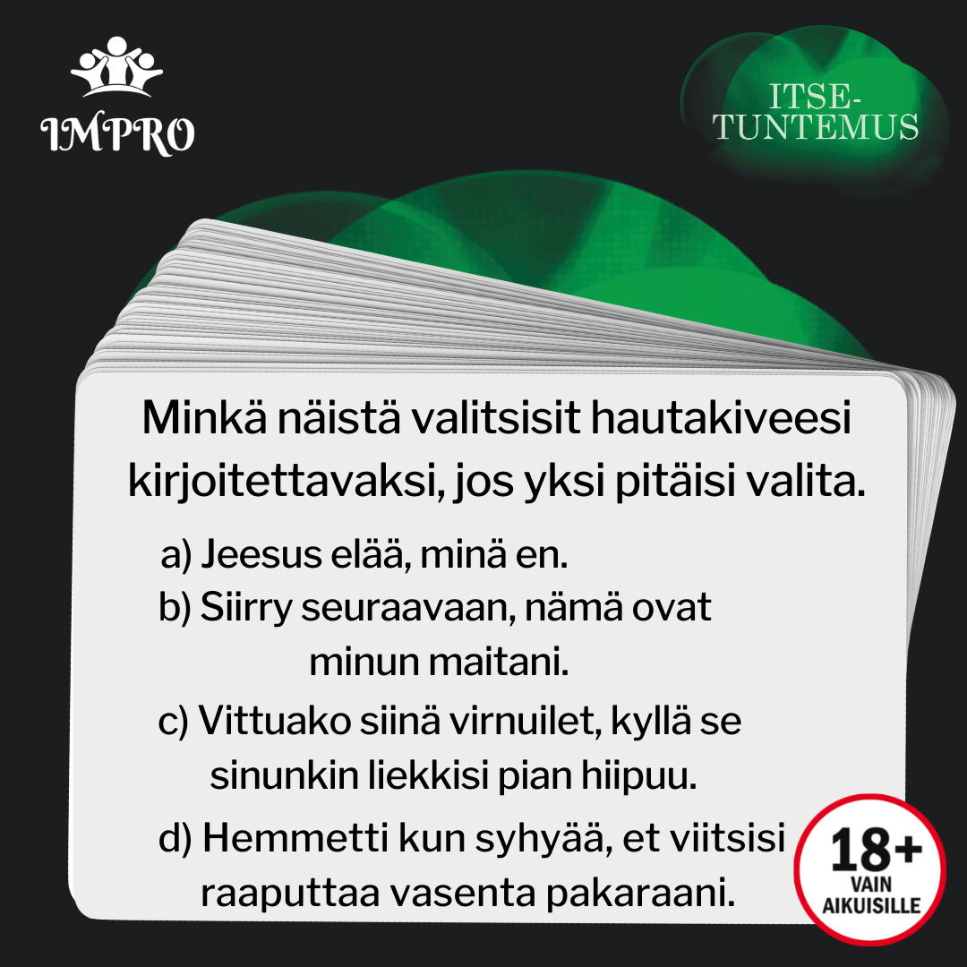 Impro-lautapeli haastaa pelaajat testaamaan itseään neljässä eri aihealueessa: Tehtävä, Luovuus, Itsetuntemus ja Mielenterveys.