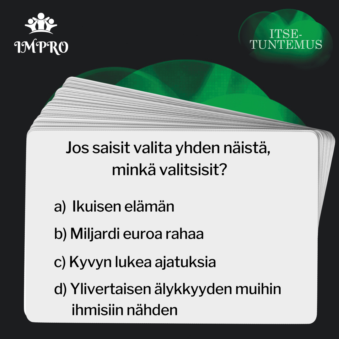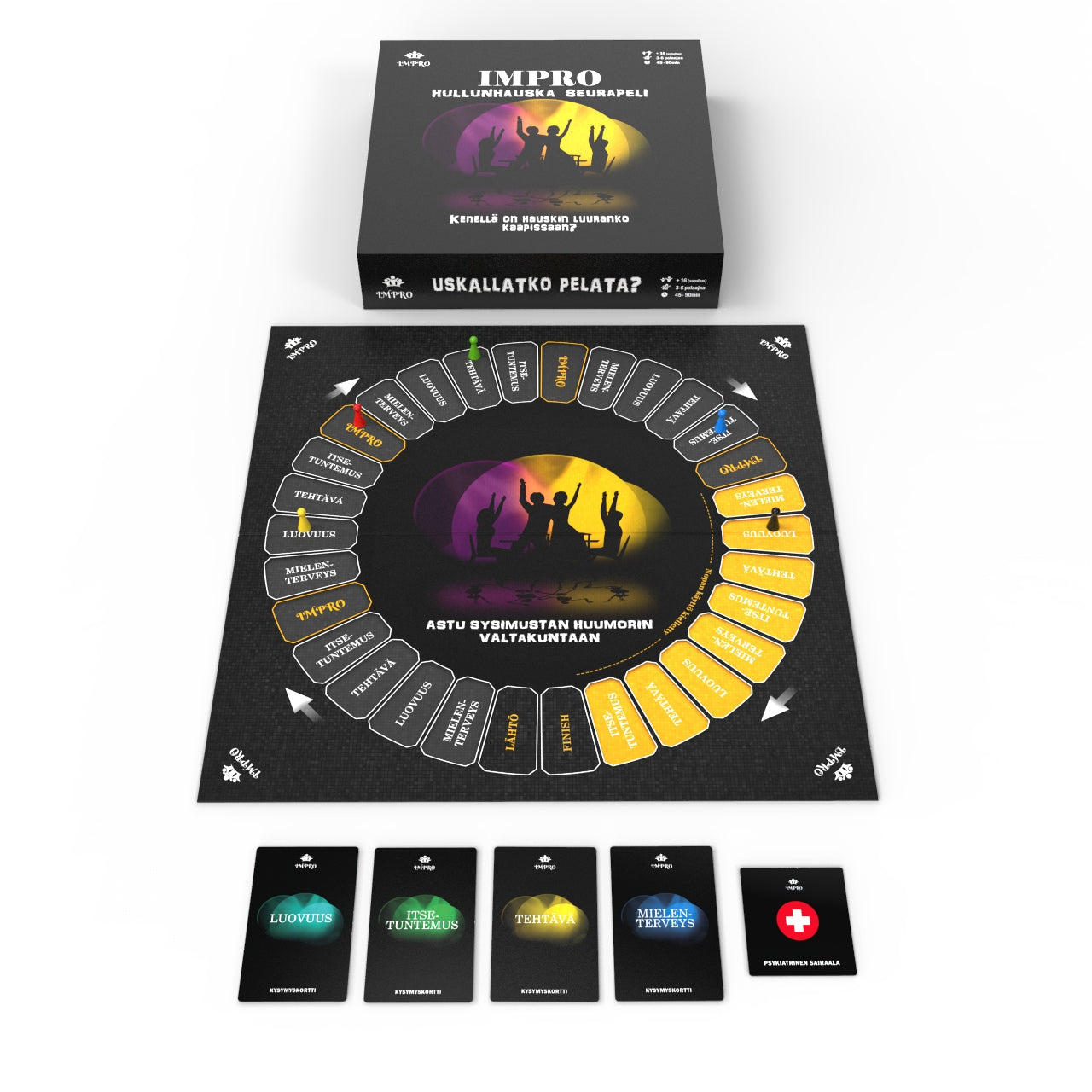 Impro-lautapeli haastaa pelaajat testaamaan itseään neljässä eri aihealueessa: Tehtävä, Luovuus, Itsetuntemus ja Mielenterveys. Peliin on saatavilla erikseen myös K18-korttipakkoja, joiden kysymyskorttien sisältö saa poskesi punoittamaan.