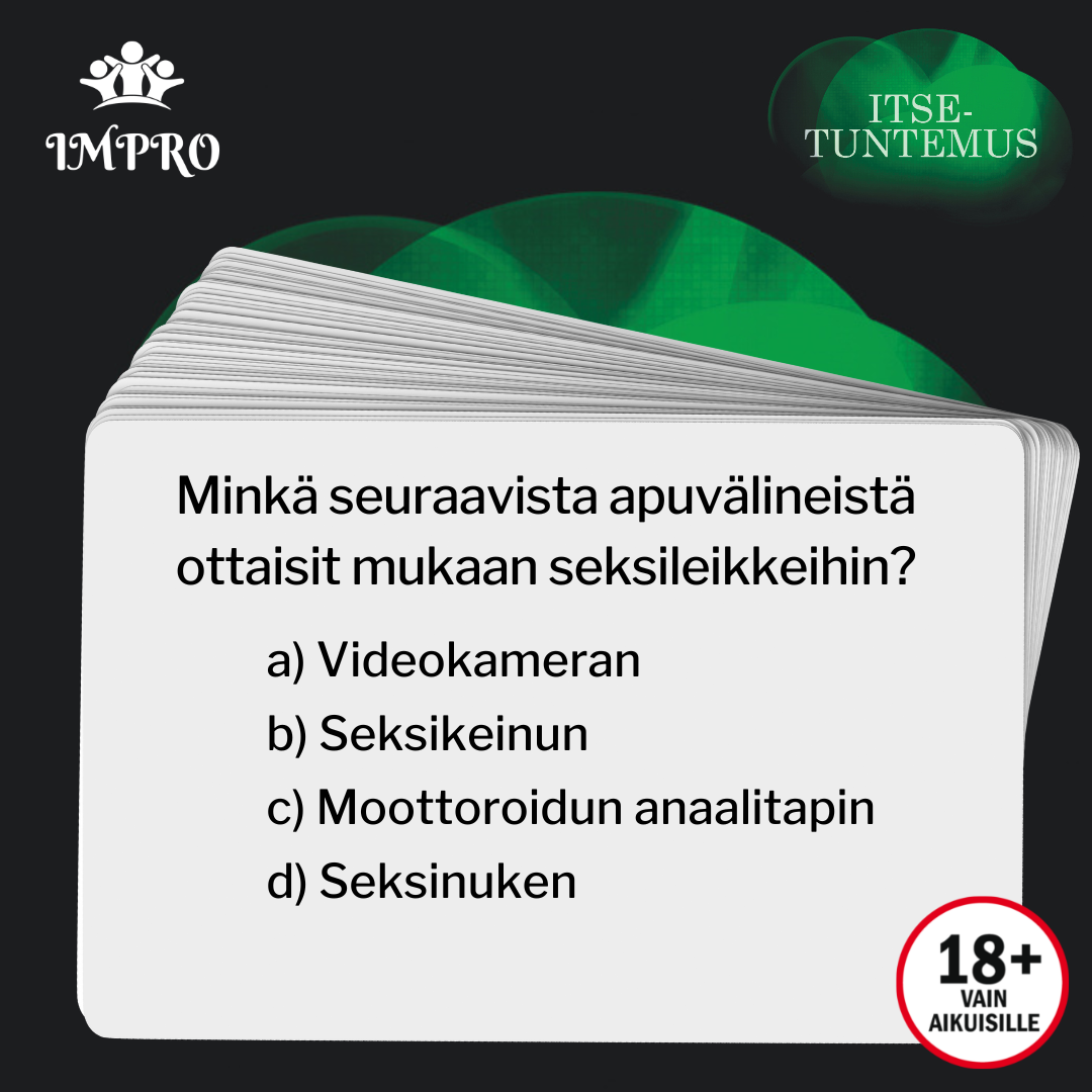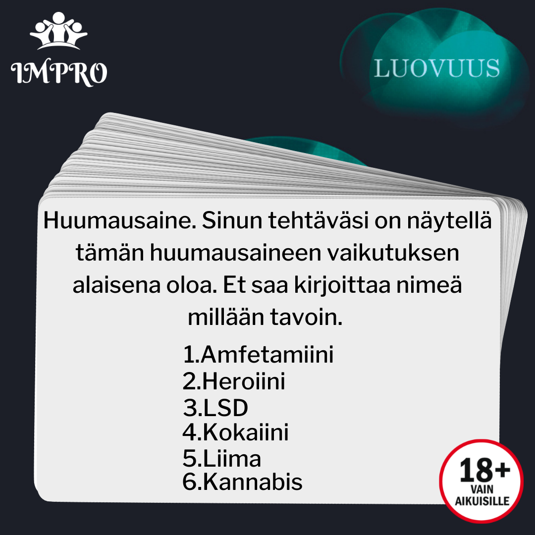 Uskallatko pelata kimpassa kavereiden kanssa? Tuhmat K18-kortit toimivat takuuvarmoina jäänmurtajina niin illanistujaisissa, polttareissa kuin muunlaisissakin bileissä. Pelissä on 52 mustalla huumorilla maustettua uskaliasta toiminnallista kysymyskorttia, jotka haastavat pelaajat niin erilaisissa tehtävissä kuin myös mielenterveydessä. Peliin tarvitset paperia ja kyniä sekä rutkasti heittäytymiskykyä huumorintajun kera. Psst! Kortit on myös mahdollista yhdistää Impro-lautapeliin.