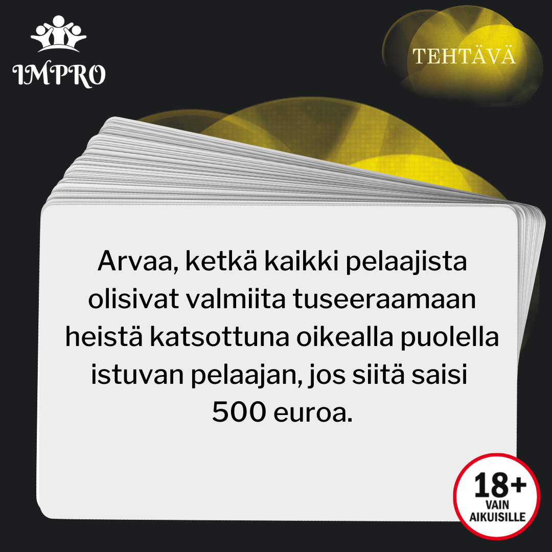 "Pelasimme Improa syntymäpäiväjuhlissani, ja ehdottomasti paras juomapeli EVER! Annamme kuusi tähteä viiden sijaan!" - Synttäriporukka Reposaaressa 2022 -
