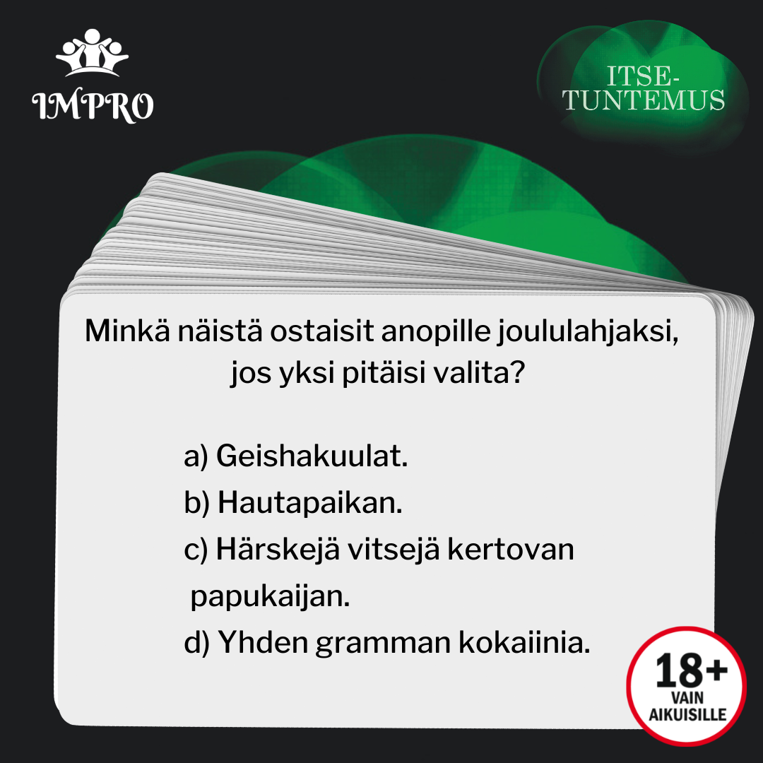 Uskallatko pelata kakkosella? Impron Tuhmat kortit ovat saaneet jatkoa! Kakkonen jatkaa siitä mihin ykkönen jäi uusilla entistä tuhmemmilla ja kutkuttavimmilla kysymyksillä! Kakkoset ovat varma valinta niin illanistujaisiin, syntymäpäiville, polttareihin tai mihin tilaisuuteen tarvitsetkaan hauskan ohjelmanumeron. Hanki oma pakkasi nyt ja varmista peli-ilta, josta puhutaan vielä pitkään!
